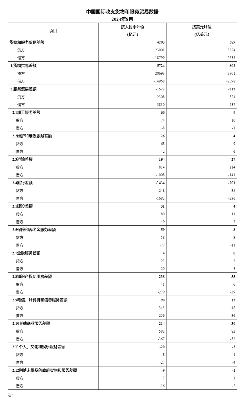 按美元计值,2024年8月,我国国际收支货物和服务贸易出口3224亿美元,进口2635亿美元,顺差589亿美元。