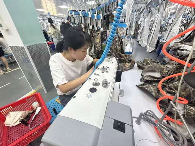 8月27日,湖北天门悦姿服饰有限公司的生产车间里,缝纫机声此起彼伏,“智慧工厂产量总看板”上的数据跳动,37岁的刘丽红正为一沓枫叶花色的女裤一一绞边。