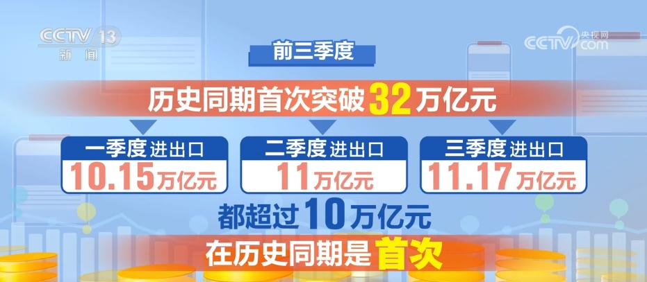 前三季度,历史同期首次突破32万亿元,各季度分别进出口10.15万亿元、11万亿元、11.17万亿元,都超过了10万亿元,这在历史同期也是首次。