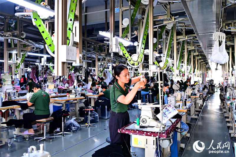 9月17日,工人在赢家时装(赣州)有限公司生产车间加工女装订单产品。人民网 朱海鹏摄