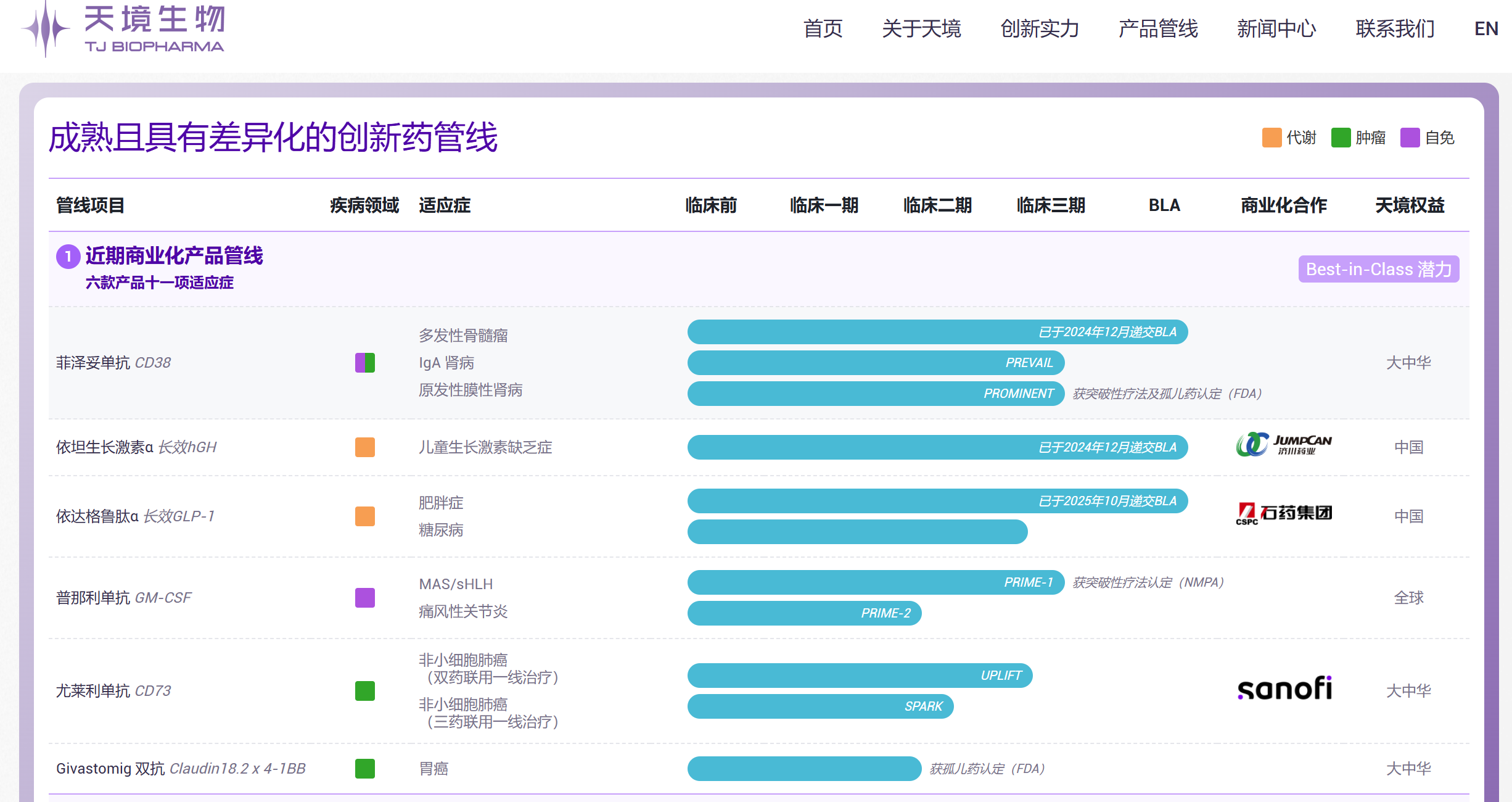 不过,和更多创新药企相比,天境生物昔日寻求的是差异化竞争,曾重点押注CD73(尤莱利单抗)、CD47(来佐利单抗)以及CD38(菲泽妥单抗)。但是这些产品之中,来佐利单抗已消失在天境生物的官网上,尤莱利单抗的大中华区权益也已交给赛诺菲。