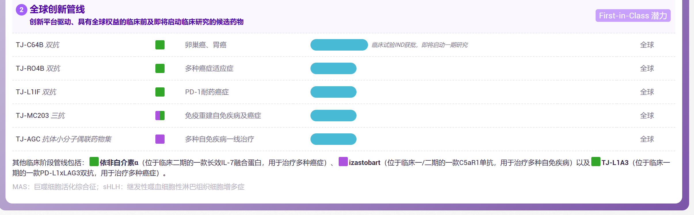 目前,天境生物正聚焦推进普那利单抗和尤莱利单抗(自研CD73抗体,赛诺菲负责商业化)等多个注册性临床或后期临床;第二梯队产品,如TJ-C64B、TJ-L1IF、TJ-PG电子客服中心MC203等也将逐步进入临床开发阶段。