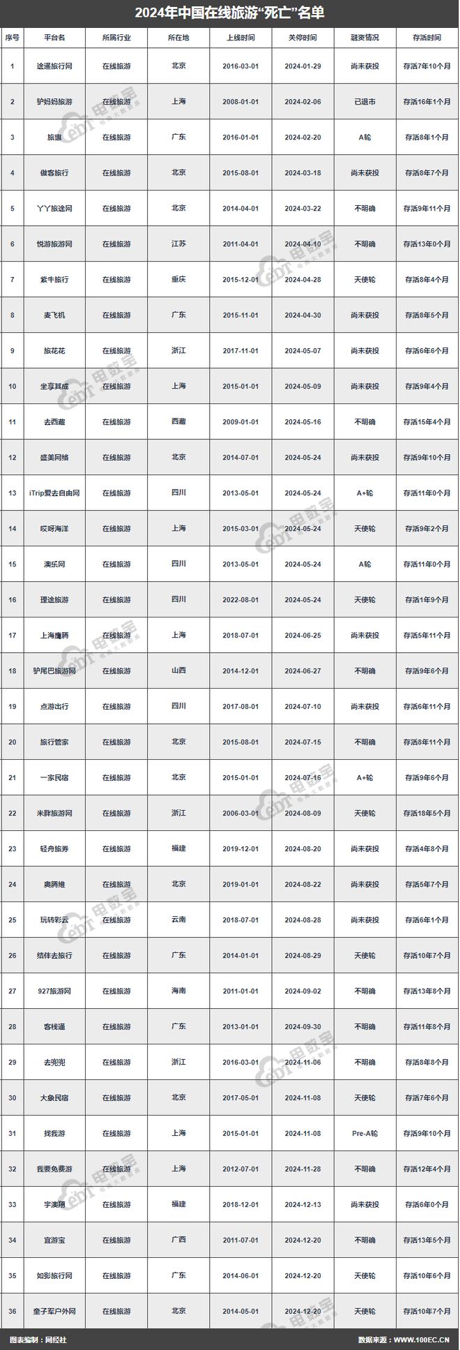 与2023年的38家相比(详见:【年终盘点】2023在线年在线旅游领域企业“死亡”数36家,2024年在线旅游“死亡”企业数量同比下降5.26%。