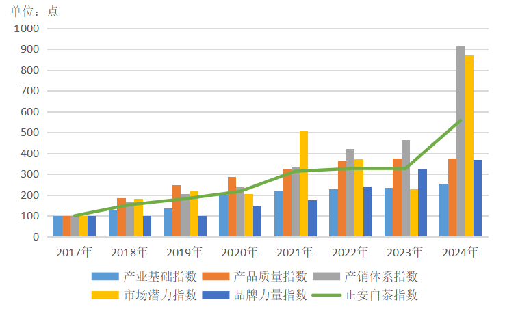 指数数据显示,截至2024年,新华·正安白茶产业发展总指数已达556.60点,同比2023年的325.71点上涨70.89%,较基期2017年100点上涨456.60%。产业基础指数、产品质量指数、产销体系指数、市场潜力指数和品牌力量指数五只子指数,自基期(2017年)以来年均复合增长率分别达到22.01%、39.17%、116.38%、109.93%、38.45%。指数高速增长是正安白茶打好“生态牌”,实行生态产业化、产业生态化的生动写照。