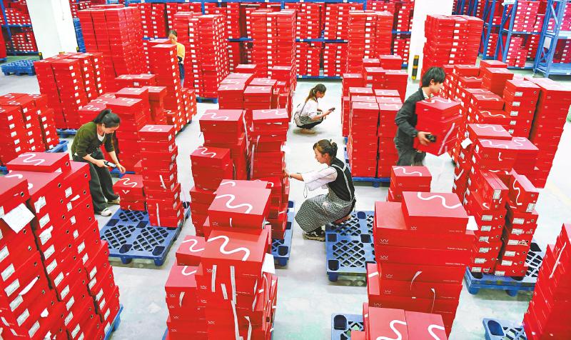 在成都市武侯区鞋都南三路百丽物流大厦,工人正在仓库PG电子玩家推荐发货。记者 李向雨 摄