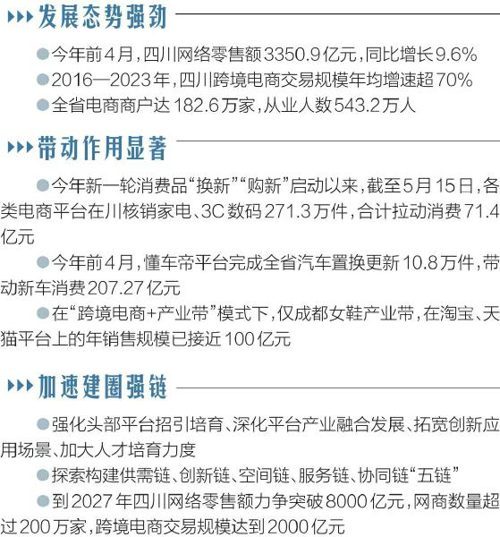 去年以来,京东、苏宁、唯品会、抖音等电商平台陆续被纳入四川消费品以旧换新支持范围,进一步强化了平台产业合作,增强了电商对本土产业和产品的拉动作用。据介绍,今年新一轮消费品“换新”“购新”启动以来,截至5月15日,各类电商平台在川核销家电、3C数码271.3万件,合计拉动消费71.4亿元。今年前4月,懂车帝平台完成全省汽车置换更新10.8万件,带动新车消费207.27亿元。