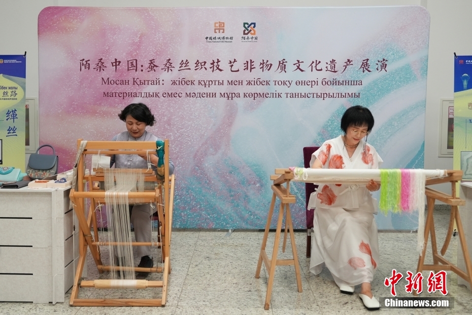 当地时间6月16日,哈萨克斯坦“中国旅游年”开幕式在位于阿斯塔纳的哈萨克斯坦国家博物馆举行。开幕式上举办了文艺演出、汉服时装秀、非遗体验等活动。图为手工艺者在非遗体验活动中演示缂丝、台绣等传统技艺。