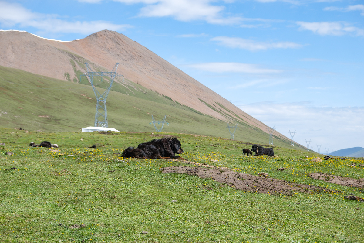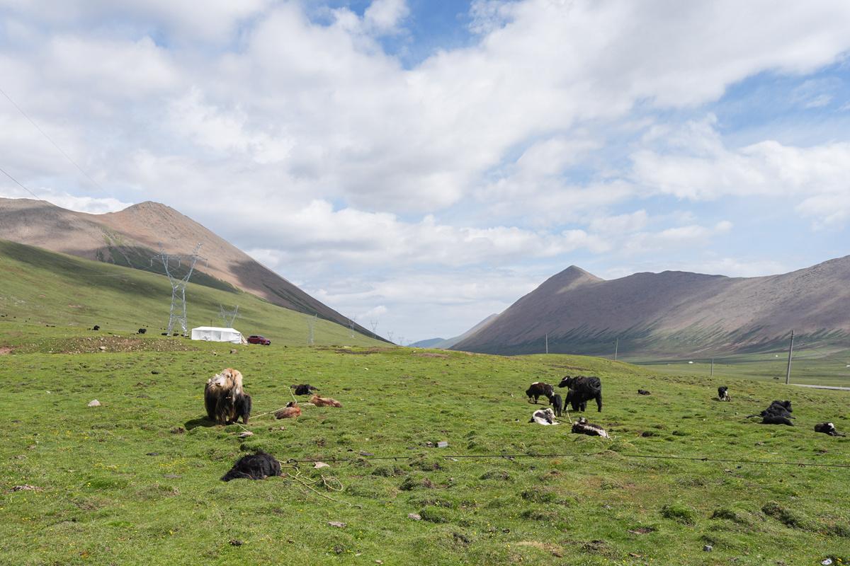 翻越海拔4825米的莫拉山垭口,沿着457省道往石渠县城方向行车还不到5分钟,就见到了左侧高山草甸上牧民尼美多吉一家的帐篷。