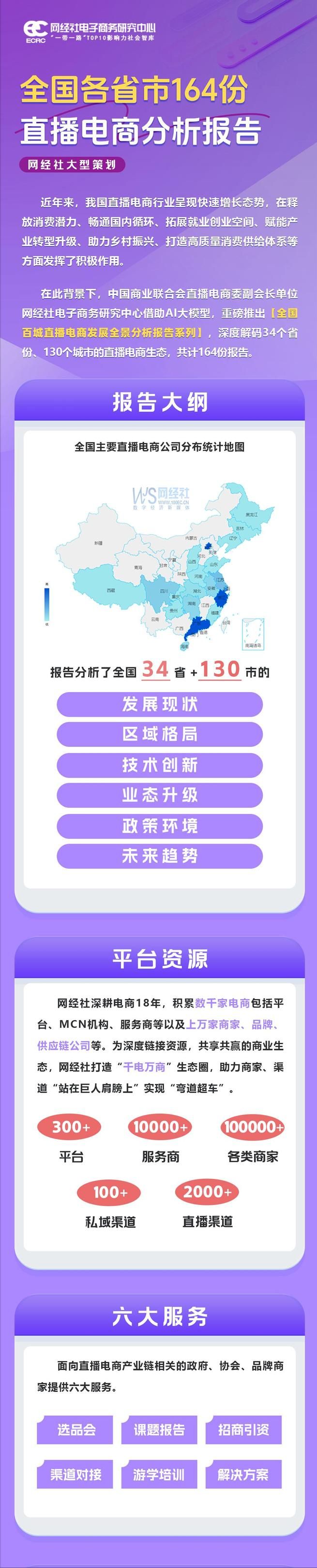在此背景下,中国商业联合会直播电商委副会长单位网经社电子商务研究中心借助AI大模型,推出《全国各省市直播电商发展全景分析报告》大型策划,通过发展现状、规模结构、产业链生态、区域发展特点及面临的挑战与机遇等维度深度解码34省/直辖市/自治区、130座城市的跨境电商生态,拟将发布共计164份报告。
