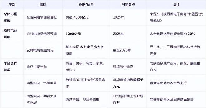 市场规模与结构: 陕西省直播电商市场规模持续扩大。根据《陕西省电子商务“十四五”发展规划》,到2025年,全省网络零售额预期突破4000亿元。农村电商方面,陕西省已基本实现农村电子商务全覆盖,县、乡、村三级物流配送体系不断完善。2025年,陕西省农村电商零售额预期达到1200亿元,占全省网络零售额比重约30%。在头部平台合作方面,抖音、快手、淘宝、京东、拼多多等平台与陕西深度合作。例如,洛川苹果产业带与抖音“山货上头条”项目合作,单场直播销售额超千万元;西安大唐不夜城景区通过抖音、视频号直播,日均吸引超百万线上观众,带动周边商品销售。