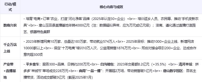 千企万店上线行动:河北省创新开展千企万店上线万人。2024年,河北省将通过开展电商基地和企业示范创建提升行动,培育电商示范基地50个、电商示范企业150个左右,培育国家级电商示范主体2个以上。2025年,河北省将助力1000家以上传统生产、商贸企业上线家以上,推动传统企业数字化转型。保定市通过十万电商公益培训项目,全年培训电商经营人员达10万人次,并通过首届直播带货公益周擂台赛,吸引省内74组选手和团队参赛,全市98家企业400多款县域特色产品参加线上线下销售,直播间总销售额1876万元,总浏览量526万次,粉丝增加约15万人。邢台市举办产业电商惠企对接(河北站)活动,联动山西、山东两地商务部门,吸引了9家国内知名电商平台以及冀晋鲁三省200余家企业参会,达成初步合作意向超300项,涵盖童车、五金、农产品等多个领域。