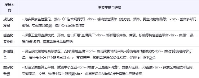 推动多域融合创新发展:河北省应推动直播电商与跨境电商、线下实体等多领域融合创新发展。应支持白沟箱包、清河羊绒等产业带通过跨境直播拓展国际市场,如白沟是全国首批淘宝镇,电商产业年成交额突破100亿元,应进一步发挥其优势。应探索市场采购+跨境电商等多业态融合发展模式,推动跨境电商拿订单、市场采购畅渠道、海外仓快交付、外综服包服务全链条出口模式。应支持电子商务企业建设O2O体验店,推动线上线下融合发展,如支持苏宁易购、中国移动、星汉供应链等电子商务企业建设O2O体验店,帮助淘鲜达、叮咚买菜等生鲜电商平台对接生产厂家,提供电商全程运营服务。
