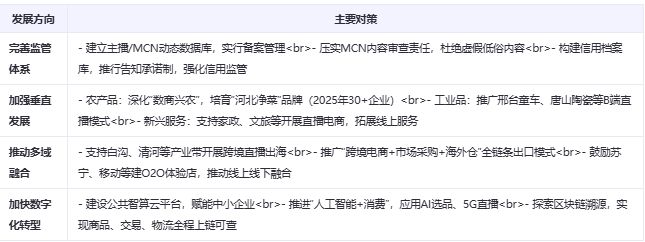 规范化发展:河北省将加强直播电商监管,推动行业健康发展。2025年1月,国家市场监管总局发布《关于加强网络直播营销活动监管的指导意见》,明确了直播电商活动中各参与主体的责任和义务,规范了直播营销行为,打击虚假宣传、假冒伪劣等违法违规行为。河北省市场监管局制定《网络直播带货广告合规提示》,从商品与服务选择、广告规范、特殊行业监管等方面为直播行业明确规范。2025年5月,河北省市场监督管理局发布《网络直播带货广告合规提示》,列出详细禁售清单,包括特殊药品、处方药、烟草制品等法律禁止发布广告或禁止在大众媒介推销的商品,以及野生动物制品、淘汰变质商品、违规校外培训服务等。河北省还将打通部门数据壁垒,整合抽检、执法、年报及信用监管数据,实现监管信息归集、主体精准画像、商品全程追溯、信息全面公示。