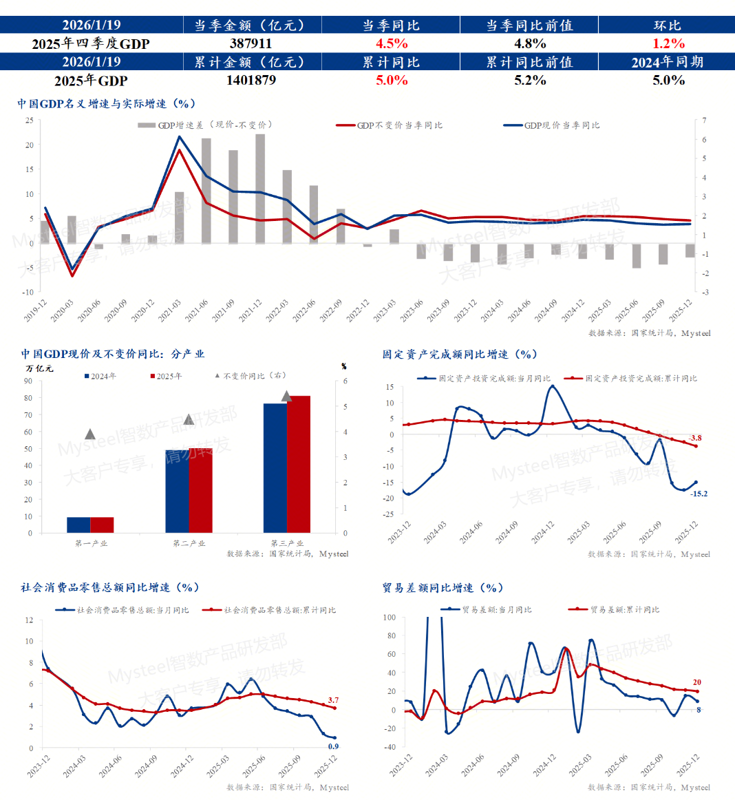 2025年主要经济数据的演变,帮助市场参与者更加理解2026年政策意图。政策需要保持战略定力,在短期“逆周期调节”以稳增长、防风险的同时,必须坚定不移地通过“跨周期调节”深化结构性改革,推动资源进一步向科技创新、产业升级和绿色转型集中,最终实现内生动能的根本性提升和高质量发展。