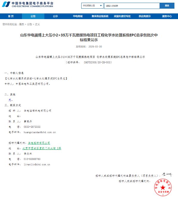 3月30日,华电集团电子商务平台发布山东华电淄博上大压小2×35万千瓦燃煤热电项目工程化学水处理系统EPC总承包批次中标结果公示,中国华电科工集团有限公司中标该燃煤热电项目工程化学水处理系统EPC总承包,投标报价:2456.1888万元。