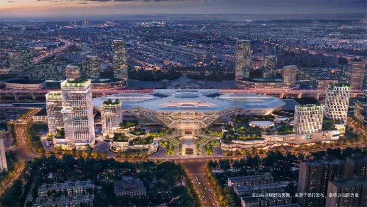 高铁宝山站枢纽总建筑面积约48万平方米。其中,站前广场建筑面积约39万平方米,含酒店、办公、商业综合服务等业态。