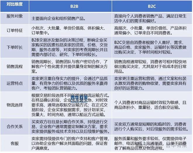 目前,我国跨境电商商业模式主要涉及B2B及B2C两种模式,C2C跨境电商交易规模小,对跨境电商总体规模影响不大。与B2B模式相比,B2C跨境电商在服务对象、订单特征、销售流程等方面存在一定的差异,具体对比情况如下: