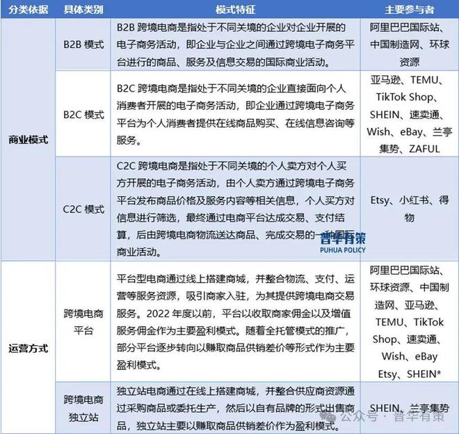 跨境电子商务简称跨境电商,是指分属于不同关境的交易主体通过跨境电子商务平台进行商品信息交流、买卖、支付结算等行为,并将合同协商、合同签订等贸易环节电子化,再通过跨境电商物流及异地仓储将商品运输至消费者指定地点处,从而完成交易的一种国际商业活动。跨境电商是一种新型贸易方式,具有全球性、无形性、匿名性、即时性、无纸化、快速演进等特征,并可根据商业模式和运营方式进行分类,具体分类情况如下: